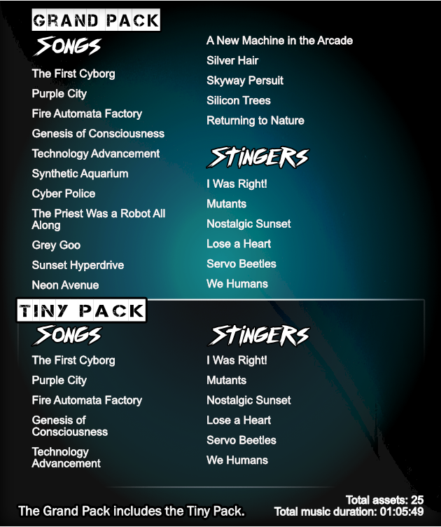 There are a total of 2 packs with different tracks and stingers, totaling 25 musical assets at your disposal. The packs are categorized into two tiers for your convenience, based on the size of your project.